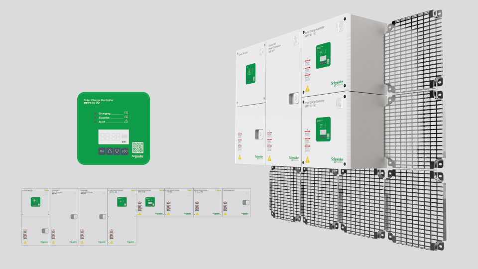 Industrial design proposal for solar inverters, charge controllers and battery storage systems in technical space environments.